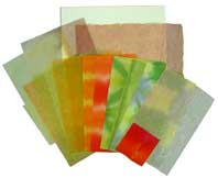 | お盆の一部を大胆にカットした、なんとも斬新な構図です。色調も明るく優しく、色相も黄~橙~黄緑と、まとまりよく素直につながっていきます。中心となる、ほおずきの実の彩度の高さと、その量が上手く決まっていますね。 ○お盆…佐治紙もみ紙で、ほんのりと写りますので、お盆の形を写しとって、まず一枚貼ります。お盆の縁はこの同じ紙を、もう一枚二重に貼ります。さらに、かげろう2種(茶系濃淡、黄系濃淡)雲竜紙、黄緑落水紙などニュアンスをつけていきます。 ○ほおずき…佐治紙折染2種で1個に1種のみ貼るのではなく、1個のほおずきに、この2種の佐治紙を大まかにちぎって張り合わせていく気持ちで描いていきます。そのほうがはるかに色の豊かな含みが出せます。そのときたて方向にシワを寄せながら貼っていくと、ほおずきの皮の表面の感じがうまく出ます。この作業にはちぎり易くしなやかで粘り気もある佐治紙が最適で自由自在に形が整えられます。実は佐治三椏紙(小型の紙) ○えのころぐさ(ねこじゃらし)…穂は土佐薄典具落水紙。茎と葉は因州紙で、この機械漉き特有のシャープな、ちぎれ方がとても効果的です。 遠い遠いあの頃の幼き日の思い出をたどりながら楽しく制作なさってみて下さいね。 (純) |