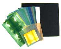 | 夏に咲く椿で、可愛らしい清楚な花です。沙羅という別名は、インドの有名な沙羅双樹に似ているからとか。 作者の対象を観察し写生する力に敬服します。 花----白の楮紙(10匁)で、そのままの厚さや裂きはぎを利用して。 葉と枝----沢山のかげろうや折染め(厚手)3枚を、色々と組み合わせを考えて貼って下さい。 |