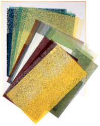 3.まず、焦げ茶を画面下から1/4位のところまで貼る。それに重ねて、下から1/2位のところまで濃緑を。若緑をいまの濃緑に少し重ねて、上から1/4位のところまで貼る。黄緑を1/2位のところから一番上まで貼る。黄色を一番上から4センチ位のところまで、さらにもう一度重ねて2センチ位まで貼る。最後に超極薄紙の深緑と浅緑の折染めを、上3センチ位のところより下に、全体に貼ってください。美しいグラデーションができあがります。(この紙は、家並みの周辺や菜の花畑の微調整用に残しておいて、ちぎって使ってもいいですよ。)