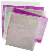 ○バック 因州極薄紙(ピンクと緑のむら染め)をまず1枚貼り、さらに画面下の方に同じものをもう一度貼って深みを出す。つぎに、ピンクの土佐極薄落水紙を全体に貼る。ほら、優しい光の雨が降りそそぐような効果が出ましたよ。