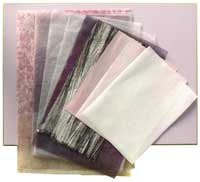 最後に花を散らす。厚紙3種に、さっきの濃い紫2色折染め極薄紙です。4種を別々にハサミで細かく切っておく。濃い色から淡い色へ、手前から遠くへと、順番に散らしていきましょう。(それぞれの色を散らすとき、ある程度、糊が乾いてからにしてください。)