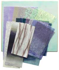 ◯奥の森 紫系むら染め(大判)3種を淡い順に1)、2)、3)とすると、1)、2)、と典具帖の紫むら染めと黄緑無地と雅染めをちぎって貼っていく。