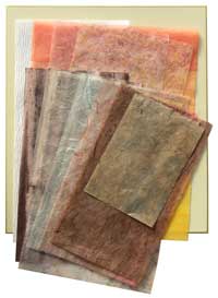 ○遠景の森。なんと、雲竜紙をフンワリとちぎって貼っていくのです。淡いグレー系紫やピンクのむら染めです。漉き込まれた長い繊維が自然に幹や枝に見えるようにしましょう。立木や画面左右からのぞく枝には、絞り染2種や雲竜紙3種をハサミで切ったり、裂いたり、繊維を抜いたりして下さい。左右からのぞく枝にカラフルな色を使うことで、日に照り輝く様子が出ます。
