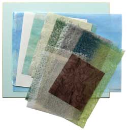 ちぎり絵を通じての友情、「紙縁」の心が伝わってまいります。 ◯式紙は淡い青です。 ◯下図を描く。島の形、鳥の位置など。 ◯三彩染め典具帖を式紙全体に一枚貼る。海から空へ、淡く淡くグラデーションとなり美しいこと! 海の部分に緑と青の雪しずく染めを、少しだけ傾けて貼る。もうこれだけで海も空も出来上がったかのようですね。もちろん海にはこの2種の紙をちぎってもう少し色を足して下さい。 ◯島・・・淡いもみむら染めで。全体の形を鉛筆で描きますが、原画の岩の高さより少しだけ高く描いておきます(これは貼るとき、わざとシワを寄せて岩の層のように見せるため)。鉄筆で切って、洞窟の穴も切り取ってしまいましょう。 岩肌の表情を付ける色は、ベージュ系むら染めと折染め、グレー系雪しずく染め。洞窟には濃い紫系の超極薄紙。 松は、こげ茶雲龍紙、春雨落水紙2種。濃い青緑と濃い緑を先に貼ってから、明るい黄緑を乗せて明暗を出しましょう。 ◯雲・・・白の因州楮紙(10匁)を裂き剥ぎして。淡いピンク系折染め超極薄紙と三彩染めも少々。 ◯波・・・白大穴落水紙と春雨落水紙。動きを付けて貼る。 ◯鳥・・・雲の残りの裂き剥ぎした部分で少しだけ薄いところが、ちぎりやすいです。なんとなく鳥の見えたら、それでよし! 洞窟用の濃い紫をチョッピリ乗せて、出来上がり。 (純子) |