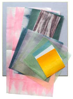 中央の花は、これをいくつかつなげて円環にします。 ◯葉 薄めの4匁原紙で、やはり灰青系は同色を折り幅の違いや絞りの有無によって二通り、です。もう一色は灰緑系折染めです。以上3種をバランス良く配置して下さい。 ◯枝 絞り染めです。裂いたり、ハサミで切ったり、して下さい。 2023年11月:季節の復活教材(オリジナル版とは入っている和紙や式紙が変更になる場合があります。) |