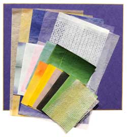日本画の伝統的なモチーフ「花鳥風月」を和紙で描いてみます。なんて面白い試みでしょう。 ◯バック・・・濃紫の式紙の上に、雪しずく染め(絞り染め)を一枚大きく貼る。 ◯月・・・淡い黄橙色2種。無地を下に、むら染めを上に重ねる。雲は白5.5匁や白極薄紙、バックの雪しずく染めで。 ◯すすき・・・白アミ目落水紙2種。厚さを少し変えて漉いてあります。どちらも、長方形の長辺の平行方向にちぎります。両手の親指の爪を使って、そっと、そっとちぎっていきます。ちょうど一匹の魚の背骨のようになりますね。そのまま両側に毛羽が出ているものと、片側はハサミで切ってすっきりさせたものと、両方を使いましょう。貼る時には、毛羽を穂先に向けて指でなでて整えるといいですよ。 ◯その他の葉や花・・・緑系折染め3種、白5.5匁、白極薄紙、濃いピンクむら染め超極薄紙、黄と橙2色折染め、黄無地など。 (純子) 注記:2023年8月季節の復活教材で発売。 |