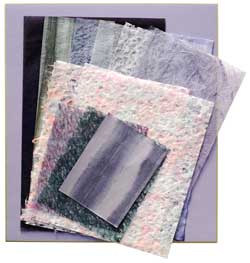 世界各地、各国で大切にされ親しまれている花がありますね。日本では・・・まず桜でしょうか。昔から詩歌に詠まれ、絵画や調度品、衣類にまで描かれてきた桜。咲き始めから満開を経て散りゆく時まで、移ろいゆく過程のすべてが人々の美意識を育ててきました。その桜、日本原生で30種以上もあり、育成種も含めると数百種もあるとのこと。それだけ愛されてきたということでしょう。 ◯下貼り・・・灰紫の式紙全体に、青紫と黒味紫の2色折染め極薄紙を貼る。画面左右に黒味紫、中央あたりに青味紫が来るようにして。 ◯橋・・・手絞り染め。まず2本の欄干(手すり)を、細く鉄筆で切っておく。上の段の欄干を貼り、次に2本の柱をその形に切って貼る。そして下の段の欄干(あらかじめ切ってありますね)を、柱と柱の間の長さに合わせて切って貼る。つなぎ目部分はカーブを付けましょう。仕上げは、この絞り染めや白極薄紙で明暗のメリハリを付けます。 ◯バック・・・画面左上方は、遠くの樹々の茂みを表現する。下貼り用や濃い緑と濃い紫の春雨落水紙をちぎって。画面右上方は、下貼り用をちぎって貼り暗くしておく。 ◯花・・・枝の線を、おおまかに色鉛筆で描いておく。そのあと、花の奥行きを出すために、ピンク系大穴落水紙(どれでもよい)を小さくちぎって右上方に所々貼り、その上に下貼り用にちぎって重ねておく。さらに広範囲に青紫と紫のむら染め春雨落水紙をちぎって、あちらこちらに貼っておく。 (純子) 2026年3月:季節の復活教材(オリジナル版とは入っている和紙や式紙が変更になる場合があります。) |