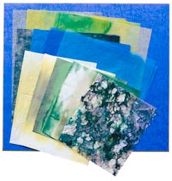 昨年の8月教材「月見草」が出た時、ふと昔読んだ太宰治の短編『富嶽百景』を思い出しました。「富士には、月見草がよく似合う。」という一節です。これを自分流に解釈してイメージを膨らませ、作品に定着してみました。したがってこの作品は、実景を写生したものではありません。心に浮かんできたものを絵にしたものです。(作者) ◯下図・・・ ポイントになる線を描く。 ◯空・・・ 式紙の色そのままを活かす。 ◯山・・・ 青無地厚紙と、濃い青と鮮やかな水色の折染め極薄紙で。 ◯湖・・・ 青系濃淡折染め超極薄紙で。濃い方を先に一枚大きく貼り、その上に淡い方を2枚重ねる。山使用の鮮やかな水色を、ひとすじかふたすじ貼って、残りの湖用の紙をちぎって重ねて下さい。あとで乾いてから鉄筆でスジを付けましょう。 ◯地面・月見草の群生・・・ 地面は原画通りに、もみむら染めを裂くようにちぎって貼っていく。貼り残した式紙の青が所々出ていてもかまいません。 ◯月見草・・・ 茎と葉は厚紙2種(白と緑絞り入り折染め、緑系折染め)。花は黄色系折染め2種で。 ※ 「月見草」として表記しましたが、植物学上はオオマツヨイグサなどの種類の花です。原画制作のイメージを大切にして、「月見草」として扱いました。 (純子) |