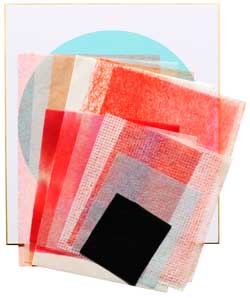 どの紙をどの順序に使うかの決まりはありません。ひとつの目安として、濃い赤系絞り入り折染め2種のどちらかを貼って(胴には濃い方を、ヒレにはそれより淡い方を)、その上にオレンジの濃いもの、淡いものと重ねていくといいでしょう。