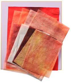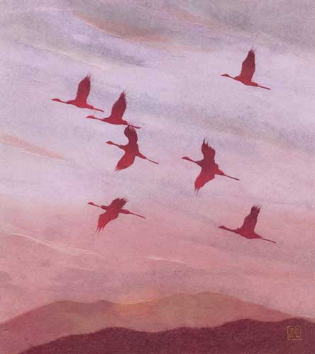 深い闇の底へ、かすかな朝の気配が漂い始めました。しらじらと明けていく暁の空へ向かって、鳥達が一斉に飛び立ちます。 ◯空(バック)・・・うす紫の式紙に特大判3種を重ねて貼る。まず正方形判の黄赤系濃淡折染め。これは淡い色が少なめにしてあります。裁断線をそのままにして貼ってしまうと、あとまで線が目立ってしまいますから、裁断線に沿って水切りかちぎるかして、毛羽を出しておきましょう。画面下端から画面1/2弱位まで貼る。下方が濃い色、上方が今の淡い色が来るようにして。 ◯山・・・遠くの山は、くすんだ暗いピンクと灰紫むら染めの上に、くすんだ濃いオレンジ系むら染めを重ねる(鉄筆で)。山の中央辺りの空を少しだけ明るくする(空用の淡い色で)。手前の山は暗い臙脂色を一重で。 ◯鳥・・・赤と黒味赤折染めの、ぼかし部分を巧く利用して下さい。 鳥は、皆様それぞれの地方で愛されているものに変えられたり、数も位置も思い思いに変えて楽しんで下さいね。 (作者) 2025年1月:季節の復活教材(オリジナル版とは入っている和紙や式紙が変更になる場合があります。) |