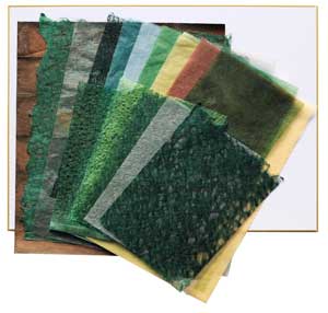○松林・・・⑥草は、【緑色系】春雨落水紙4種、【緑色濃淡折染め】極薄紙、【濃い緑むら染め】極薄紙を重ね貼る。⑦木は、【茶色ぼかし染め】厚紙を繋ぎ合わせたり曲げたりして貼る。その際、枝も貼る。⑧木肌は、【茶系雪しずく染め】超々極薄紙、【濃い緑色】春雨落水紙(大判)、白超々極薄紙をちぎり重ね貼る。⑨松葉は、【濃い緑色】春雨落水紙(大判)、【緑色】大穴落水紙(大判)をちぎり貼り、松葉の明暗に、【濃い緑色】大穴落水紙(小判)、【濃い緑色】春雨落水紙(大判)、【緑色濃淡折染め】春雨落水紙を重ね貼る。⑩道や松林に、【グレー色無地】超極薄紙を重ね貼り調子をつける。