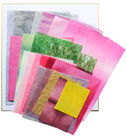 <ピンク系折染め>厚紙5種を貼り、<赤系絞染め>極薄紙、<ピンク系濃淡折染め> 超極薄紙を重ね貼る。主役は、白4匁を下地に貼る。