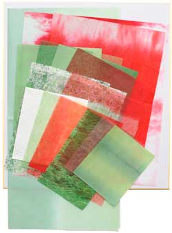 <淡い緑系濃淡折染め>厚紙を切り貼り、<緑系濃淡折染め>極薄紙を重ね貼る。