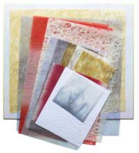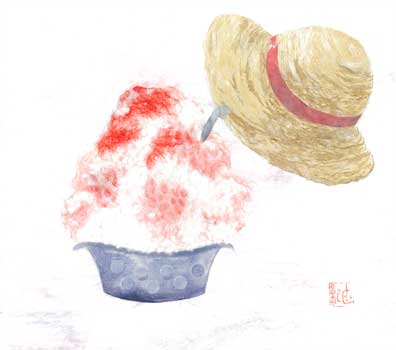 夏休み、ラジオ体操、虫取り、海水浴、夏祭り、浴衣、花火、蚊取り線香、風鈴、蚊帳、団扇、かき氷、麦わら帽子…。夏の風物詩、いくつもいくつも思い出されますね。それにつながる懐かしい人々の顔も。思い出は、どんなものにも奪われない大切な宝物です。 ○ガラスの器 濃い青系折り染め超極薄紙(A)で形を写して、水玉模様も描いておく。白鉛筆の芯を少し濡らすとひっかかりません。鉄筆で水玉を切り、抜いた丸い形も取っておく。淡い灰青折り染め(3匁)の上に重ねて全体の形を鉄筆で切る。器のふち、底は(A)で色を補う。水玉の穴の所に、切り抜いた丸を少しズラして貼る。 ○かき氷 淡い淡い(白ではありません)大穴落水紙顔料染め(B)で氷全体の形にちぎり、貼ってベースとする。赤とピンク折り染め落水紙(機械漉き)を適当にちぎって貼っていく。次に(B)を貼っていくのですが、ちぎって貼っていく方法と、作者のように氷全体に貼り、その際、糊は輪郭線のみにつけて内側は浮かしておく、という方法もあります。これは(B)の発色をよくするためです。檀紙を2枚に剥ぎ、鉄筆のお尻で押さえて小さくちぎって氷の白い所に貼っていく。最後に赤の落水紙を氷の上の方に少し加える。 ○帽子 あやとり紙4種。大判ので全体の形を描き、これはハサミで切りましょう。この上に、この紙とあとの3種をちぎりながらカーブに沿って貼っていく。リボンは厚紙の赤と、暗い臙脂系折り染め機械漉き典具帖。カーブの形そのままを切って貼ってもよし、テープ状に切ったものを曲げながら貼ってもよし、どちらでもOKです。 |