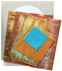 大判の赤系の絞り染め2種と、中判の黄色系の絞り染め2種を使います。彩りの気に入ったところを、見本の分割幅に合わせて何本か帯状にちぎり、それをさらに小さくちぎって各分割部分をチョッチョ、チョッチョと埋めていきます。隣と離れても重なっても気にしない。気になるなら後で手を入れましょう。