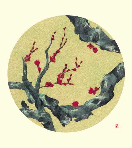 〇紅梅・・・花びらは【赤絞り染め】厚紙をちぎって貼る。蕾は、鉄筆のお尻でひっぱりちぎって貼る。(鉄筆で形を整えます)花心は、【赤茶系】極薄紙をちぎり貼り、鉄筆で丸く整えます。おしべ・めしべは、【白】4匁と【黄色無地】厚紙で。